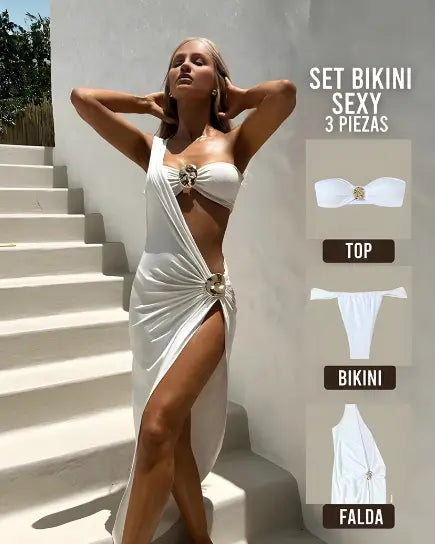 Este traje de baño de tres piezas esta diseñado para brindarte una apariencia elegante. Con su diseño premium y materiales de alta calidad, te sentirás cómoda y segura en cada uso.