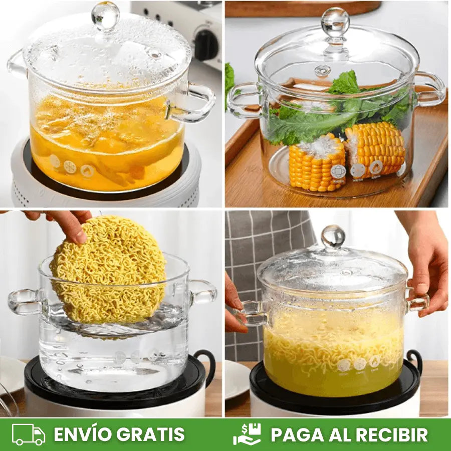 La cocción en nuestra olla de vidrio resistente a altas temperaturas ayuda a retener los nutrientes y el sabor natural de los alimentos, permitiéndote disfrutar de comidas saludables y auténticas.
