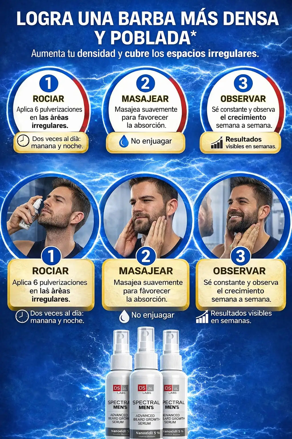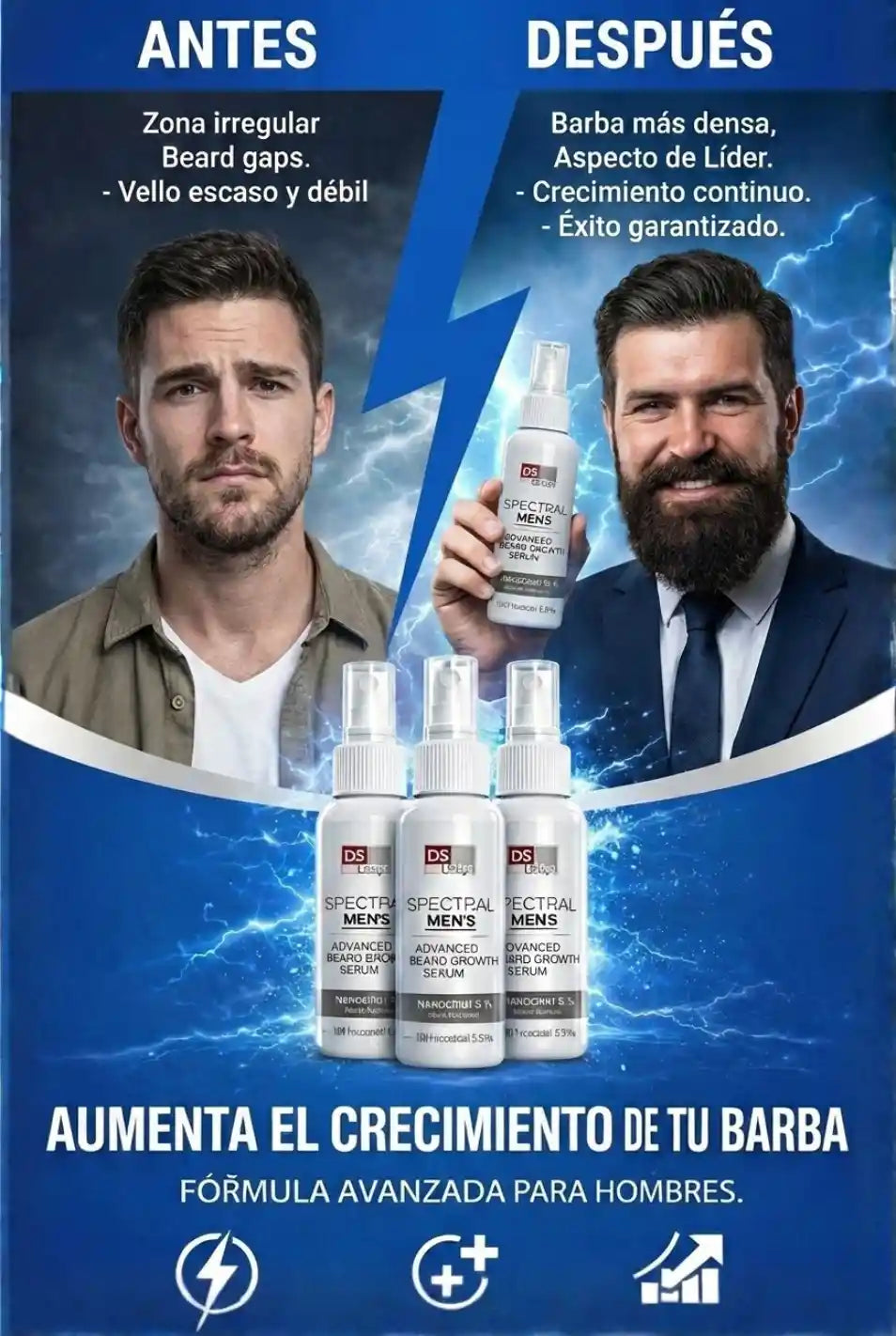 Sí. Spectral Men’s está diseñado para estimular el crecimiento en zonas con poco o nulo vello, fortaleciendo los folículos y ayudando a una barba más densa y uniforme.