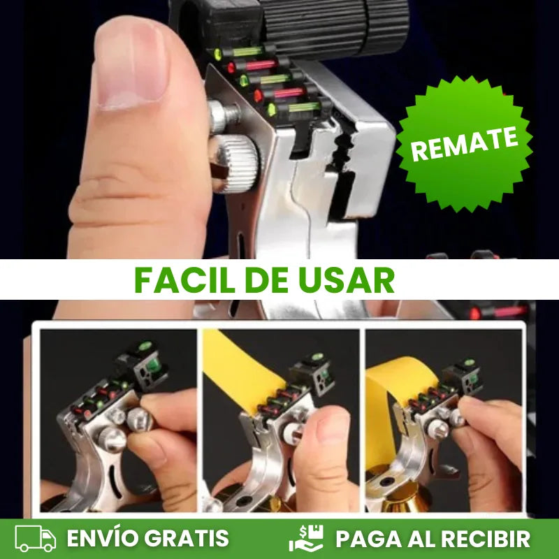 Con una estructura antideslizante y una banda de goma resistente, esta resorteraofrece una puntería mejorada gracias a su mira láser integrada, lo que permite una mayor precisión, incluso para principiantes.
